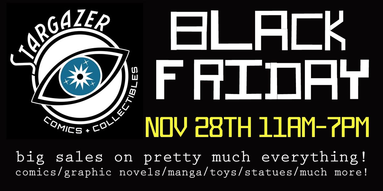 Take a break away from the big box store insanity and get some radical deals at Stargazer instead! We'll be offering up big savings throughout the shop and opening up an hour early at 11 AM.